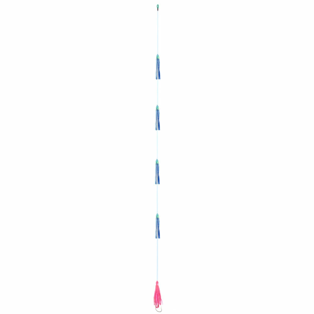 A Blue Water Candy Daisy Chain is an easy to fish Mahi lure that is also great for catching Blackfin Tuna. These lightweight chains are nicely rigged and work well with reels down to TLD25/Squall size. You’ll notice that each chain features four squid bodies in line, with the fifth squid featuring a Mylar insert for added flash, along with dual Mustad 8/0 hooks. Because of the tandem hooks, you’ll have a better chance at nabbing those pesky short strikes. Blue Water Candy uses chafe protection on the loops to ensure that you get plenty of life out of your new daisy chain.Â