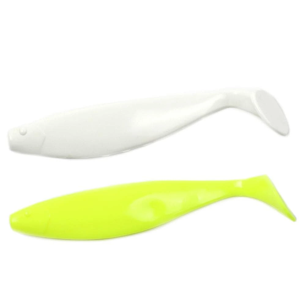 Blue Water Candy Rock Fish Candy Shad are a staple for Striper fisherman on the East Coast.  These durable, rubber shad bodies are ideal for use on umbrella rigs and Mojo fishing lures. The paddle tail flaps like it’s nobody’s business when going through the water. The natural swimming action helps attract big fish. Measuring 9″ in overall length, we stock them both individually and in 12 count packs.  We offer the two most popular colors of these rubber shad, brilliant white and super bright chartreuse.  As the old saying goes “if it ain’t chartreuse, what’s the use?”. These have become a very popular item when trolling for Rockfish. Made in the USA.
