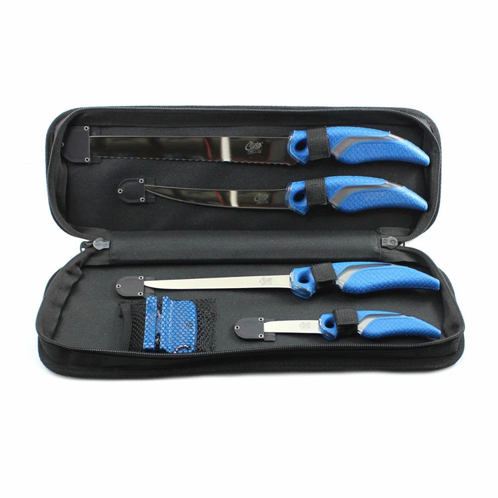 - Chunk Knife 18830, Bait Knife 18834, 6″ Fillet Knife 18831, Curved Boning Knife 18833, Sharpener, Ballistic Nylon Storage Case