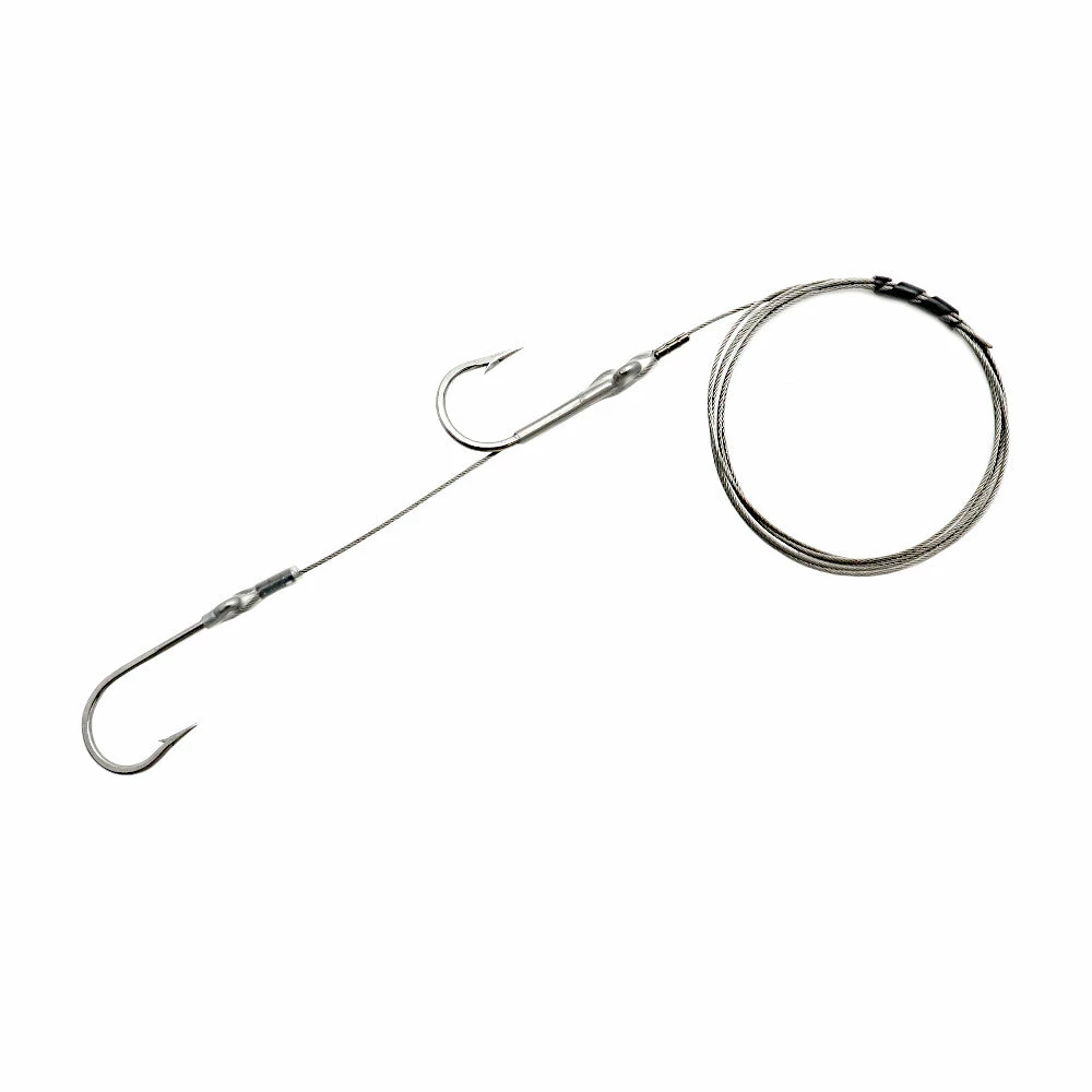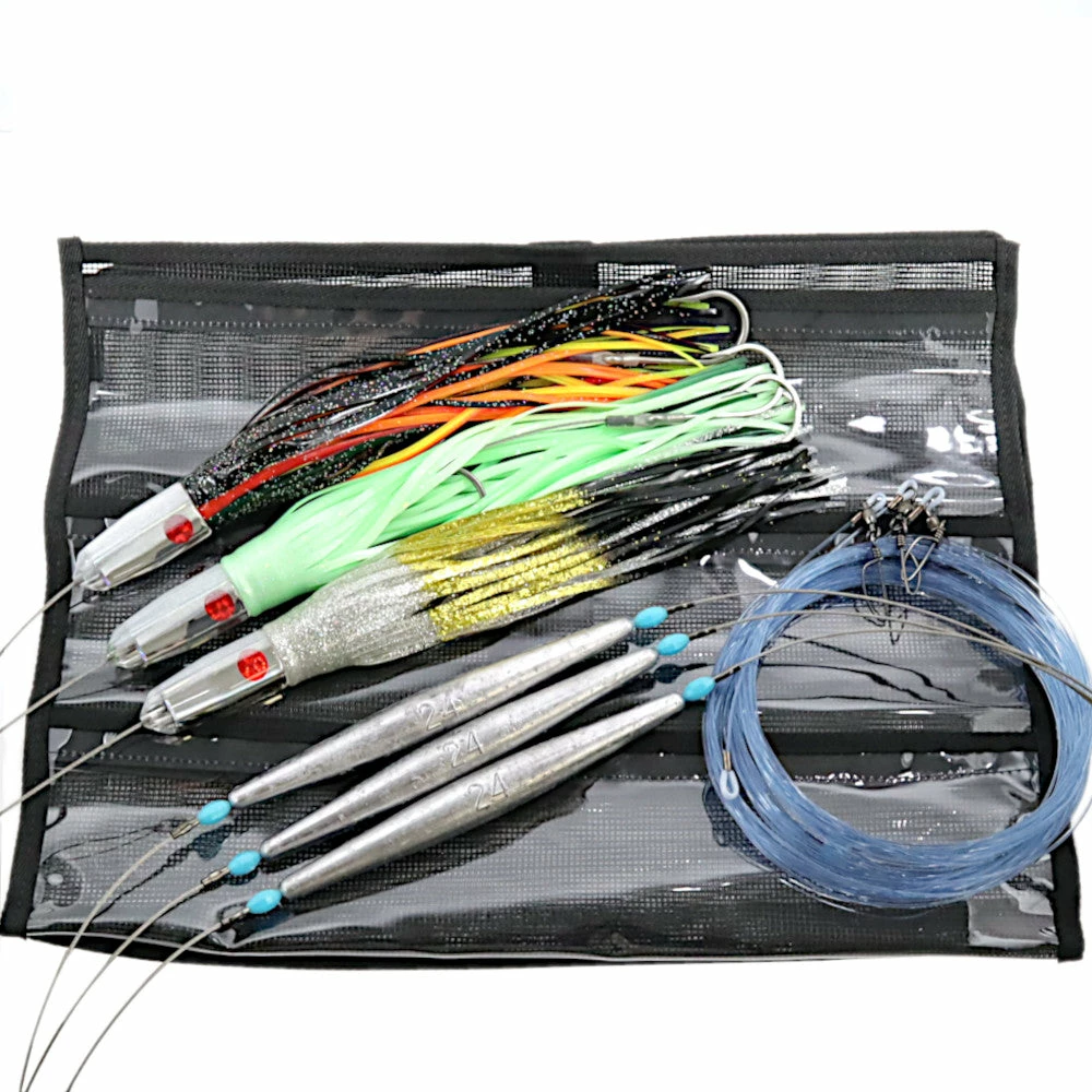 - Quantity 3 rigged lures with double 9/0 stainless hooksets on 480 lb stainless steel cable – 6 ft. leader