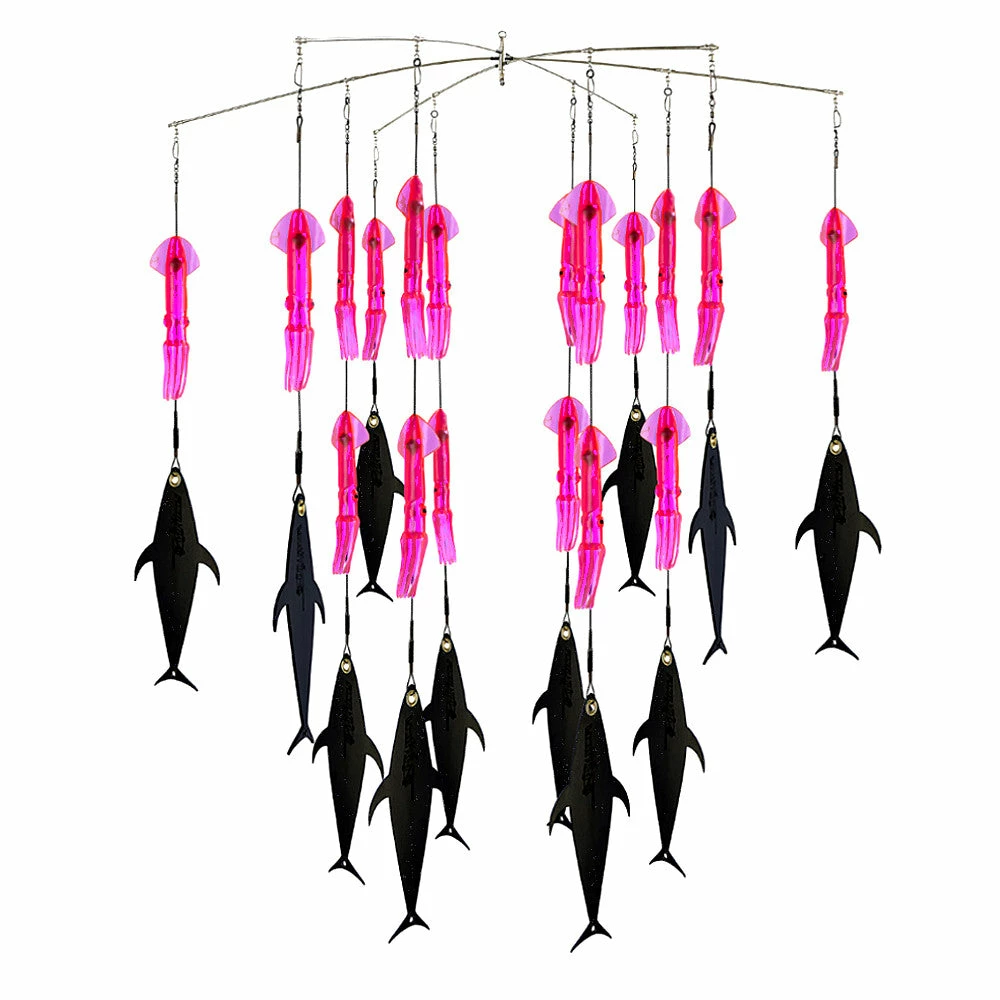 This dredge is very effective for a multitude of species. The dual presentation of squid and flaps makes this dredge a great fish raiser that is also easy to use. Because of the flaps, this dredge weighs less and pulls significantly less drag then traditional squid dredges. 18 Fish Razr full body 9”squids with 12, 12” FlapZ hanging from a 38” heavy bar. The outside loops have chains of one squid with one FlapZ, the inside loops consist of two squid and one FlapZ. All custom built using 400lb monofilament and heavy tackle. Available in black sparkle, blue sparkle, pink florescent, green sparkle and red sparkle. Custom colors available. Comes in a mesh carry bag for easy storage.