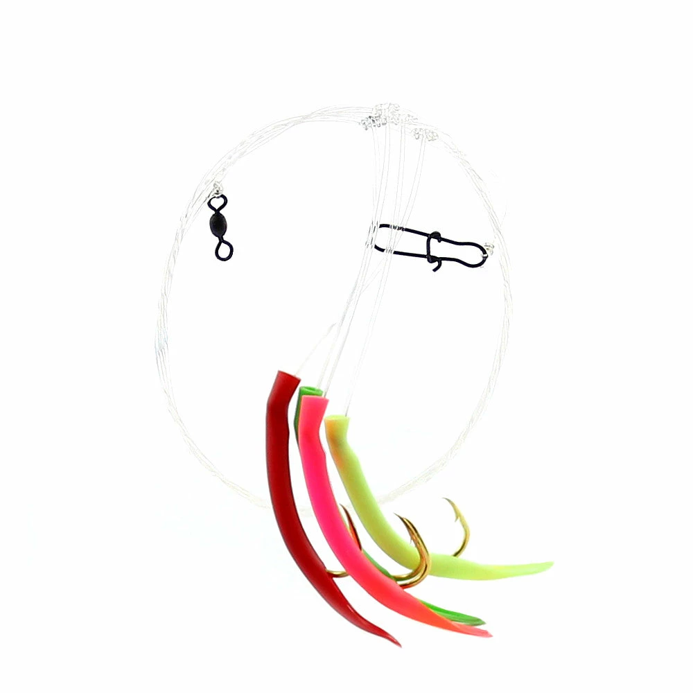 - Four 3/0 gold Mustad hooks are hidden with brightly colored surgical tubing that dances in the water as you troll