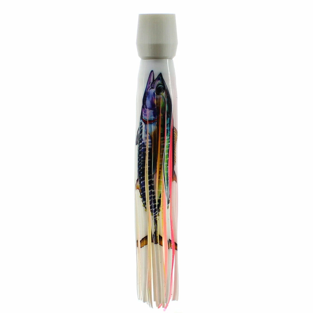 The Pakula 3D Fish Print Wombat is best for trolling on your short corner or short rigger. This stubby head features an aggressive action that shakes as it trolls, producing a big splash as it comes up for air. You’ll find that the Wombat swims well, even in rough sea conditions and at most normal trolling speeds. As with the other Fish Print series lures, the Pakula Wombat has a UV outer skirt with lifelike fish and a a Lumo inner. This skirt combination results in an incredible presentation.Â
