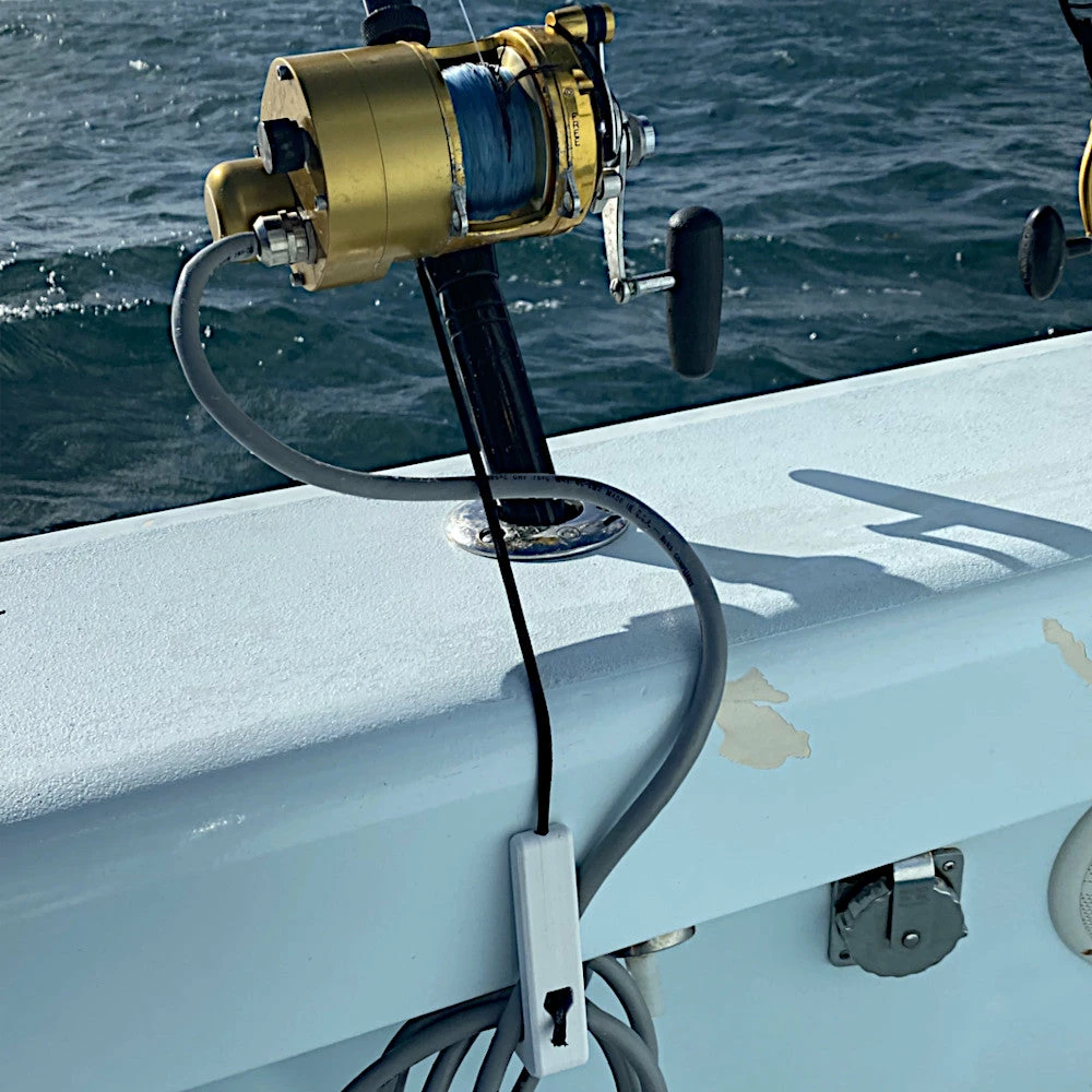 Rod leashes are all but standard issue equipment these days. With rods and reels becoming such a huge part of your offshore fishing investment, it’s imperative to take measures that protect your gear. These cool little 3D printed rod bungees from R&R are fast to deploy and easy to use. Simply wrap the bungee around your rod, and hook the L bracket under your gunnel. This set-up uses that tension to keep things tight and secure while under way. Â
