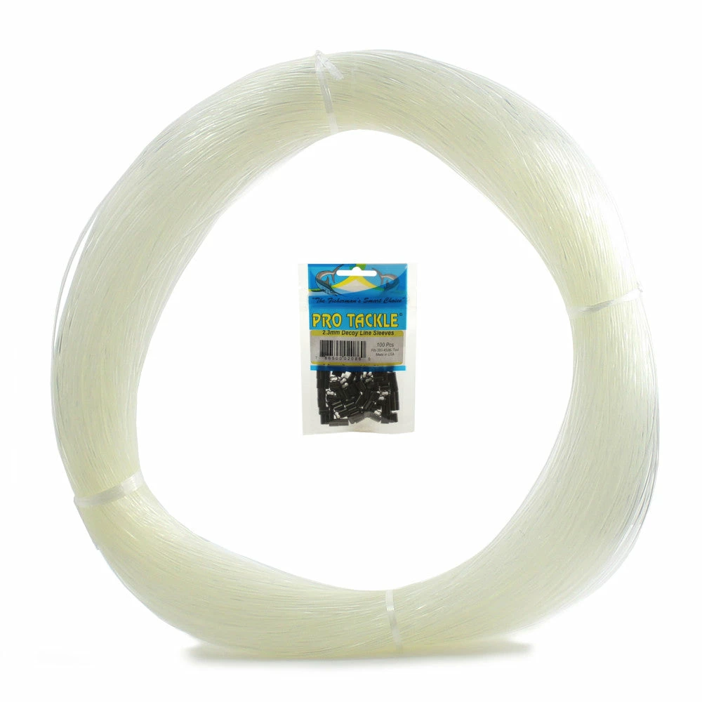 The decoy drop line rigging kits from SNL come in 4 easy to use options. You can get your clear monofilament pre-cut in 48 inch lengths or continuous. You can also choose to get a kit that has a crimp tool included, or leave it off if you’d like to save some cash. Each kit comes with 2.3mm Pro Tackle decoy sleeves. Â